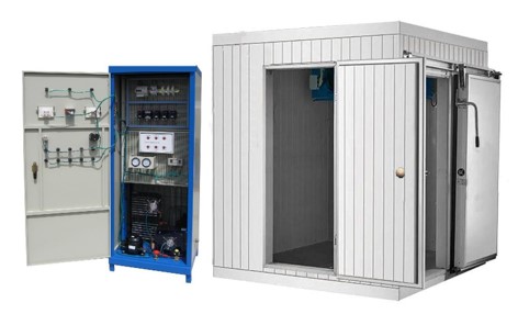 實(shí)訓裝置主要由控制柜、水冷制冷機組、高溫拼裝式冷庫,低溫拼裝式冷庫、主機實(shí)訓模塊、連軸式冷卻水泵,冷卻塔,溫度和壓力傳感器等組成。