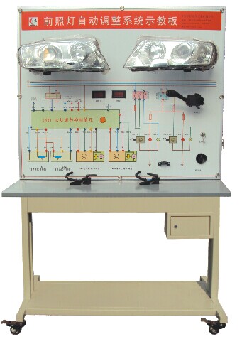 車(chē)燈控制單元、左右氙氣大燈總成、車(chē)身高度傳感器、組合開(kāi)關(guān)等。并輔以發(fā)動(dòng)機轉速控制器,車(chē)速控制器,車(chē)燈照明LED動(dòng)態(tài)顯示器等。檢測端子、故障設置系統、大容量蓄電池或12V開(kāi)關(guān)電源、大型彩色噴繪電路原理圖、控制面板、可移動(dòng)臺架、使用說(shuō)明書(shū)及實(shí)訓指導書(shū)等。