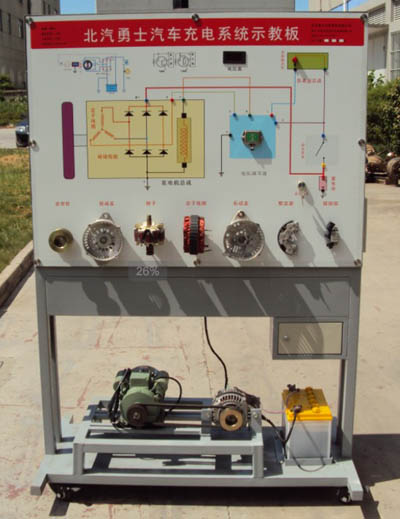 設備由勇士原車(chē)發(fā)電機,蓄電池、電壓表、電流表、大功率負載、充電指示燈、空氣開(kāi)關(guān)、帶安全保險的電源輸入接口、電源線(xiàn)、考核系統、電動(dòng)機及所有充電系統相關(guān)部件組成,在設備的中間部位,為完整的發(fā)電機分解部件。設備的下部為蓄電池、發(fā)電機、電動(dòng)機。上部為高清噴繪彩色原理圖面板、故障設置及故障排除系統、控制面板、可移動(dòng)臺架。配套設備使用說(shuō)明,實(shí)訓指導資料、產(chǎn)品合格證、保修卡。