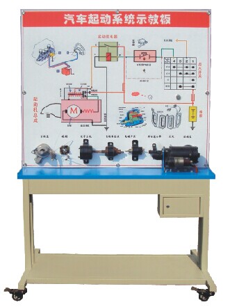 示教板上半部分為起動(dòng)機的分解零部件,下半部分為實(shí)物總成;蓄電池、點(diǎn)火開(kāi)關(guān)、電源總開(kāi)關(guān)、彩色原理與結構圖、故障設置系統、使用說(shuō)明書(shū)及任務(wù)驅動(dòng)式實(shí)訓指導書(shū)等。